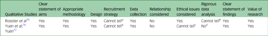 Quality appraisal of qualitative evaluations was undertaken using the Critical Appraisal Skills Programme Qualitative Research Checklist (CASP),69 a tool recommended by the Cochrane Qualitative Research Methods Group.Reference Hannes, Noyes, Booth, Hannes, Harden, Harris and Lwein70 The CASP's criteria (aims, methodology, design, recruitment strategy, data collection, researcher/sample relationship, ethical issues, data analysis, statement of findings, value of research) allow the derivation of an overall assessment of a study's quality as strong, moderate or weak.Reference Hodgins, Gnich, Ross, Sherriff and Worlledge-Andrew71 Evaluations were graded as weak if they did not meet both of the first two criteria, and as moderate or strong based on the remaining eight criteria. For both EPHPP and CASP, after independent ratings, reviewers discussed ratings with discrepancies and reached consensus.