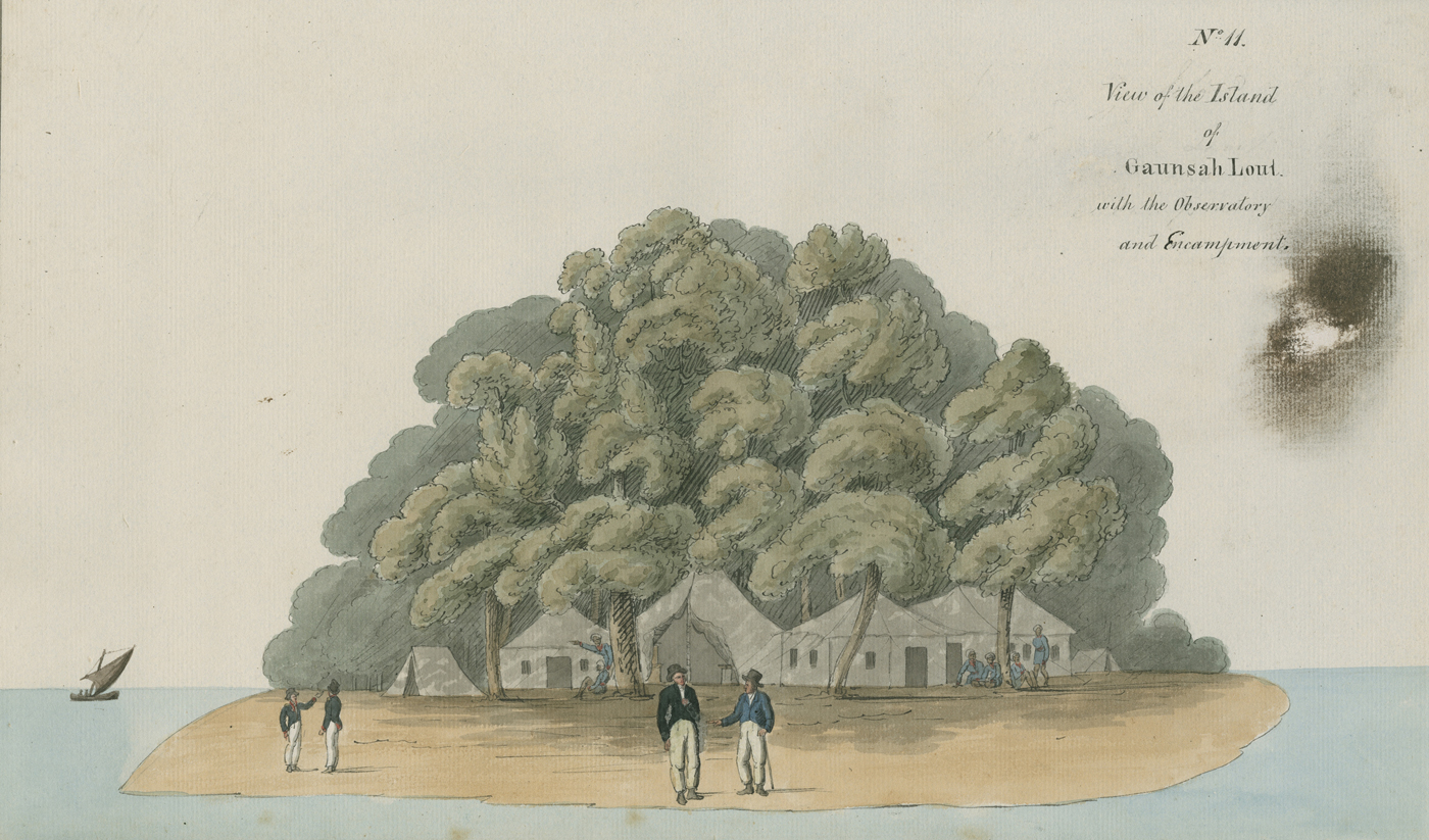 Figure 1. ‘View of the Island of Gaunsah Lout with the Observatory and Encampments’, in John Goldingham, Report of the Length of the Pendulum at the Equator (Madras: Madras Observatory, 1824), Image no IRS. 10694, © Royal Society.