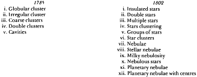 22 Sticker, B., “Artificial” and ‘natural’ classifications of celestial bodies in the work of William Herschel', Proceedings of the Xth international congress of the history of science, Ithaca, 1962, ii, 729–31Google Scholar. Compare the forms of 1785 with the classes of 1802: