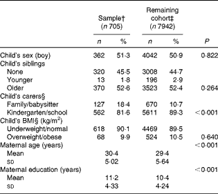 In Table 1, the characteristics of eligible participants are compared with those of the remaining cohort evaluated at baseline. In the present study, mothers were slightly more educated (11·2 (sd 4·33) v. 10·4 (sd 4·24) years, P< 0·001) and older (30·4 (sd 5·02) v. 29·4 (sd 5·64) years, P< 0·001) than the remaining mothers evaluated at baseline. In the study sample, more children were being taken care of by family or babysitter (18·4 v. 10·7 %, P< 0·001). No significant differences were found concerning child's sex and BMI and child's siblings.