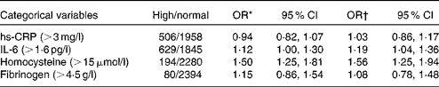 All markers of inflammation were analysed as categorical variables using conventional cut-off points. As recommended by the Centers for Disease Control and Prevention (CDC) and the American Heart Association, we dichotomised hs-CRP at the level of 3 mg/l( Reference Pearson, Mensah and Alexander 7 ), categorised homocysteine at the level of 15 μmol/l( Reference Welch and Loscalzo 39 ) and fibrinogen at the level of 4·5 g/l, considering measurements greater than this level as indicative of higher CVD risk. IL-6 was categorised at a detection level of 1·6 pg/ml( Reference Hoebeeck, Rietzschel and Langlois 28 ). As there were no clear cut-off values for leucocyte count, it was not analysed.