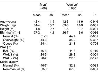 Subject characteristics, anthropometric measurements and social class categories of the 1519 subjects (689 men and 830 women) are presented in Table 1. There was no difference in age between the men and women (P = 0·946). Women were significantly shorter (P < 0·001), lighter (P < 0·001), had a lower BMI (P = 0·036) and were more likely to be of normal weight than men (P < 0·001). There were no differences in the proportion of men and women who were classified as either overweight (P = 0·387) or obese (P = 0·705). Significantly more women than men were classified as having ‘WAL 1’ (P < 0·001). No differences were observed in ‘below action level’ (P = 0·110) or ‘WAL 2’ (P = 0·175) between men and women.