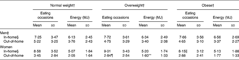 Compared with the men, the women recorded significantly more (8·6 (sd 3·4) v. 7·6 (sd 3·6); P < 0·001) in-home eating occasions but recorded significantly less (3·1 (sd 2·7) v. 4·9 (sd 3·2); P < 0·001) out-of-home eating occasions. Table 3 displays the mean daily in-home and out-of-home eating occasions and related EI for men and women across weight-status categories. In-home or out-of-home eating occasions or EI did not vary by weight-status category in men. However, overweight women recorded significantly more in-home eating occasions compared with obese women (P = 0·027), while normal weight women recorded significantly more out-of-home eating occasions compared with overweight women (P = 0·011). EI consumed outside of the home was also significantly higher for normal weight women compared with overweight women (P < 0·001).