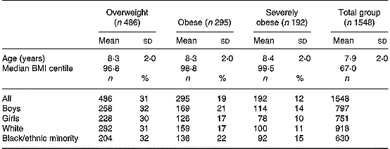 The percentage of children categorised as overweight (BMI ≥ 85th centile), obese (BMI ≥ 95th centile) and severely obese (BMI ≥ 98th centile) was higher than the UK reference standards (Table 1). Results show that 31 % of children were overweight (reference standard 15 %), 19 % were obese (reference standard 5 %) and 12 % were severely obese (reference standard 2 %). Table 1 also presents the prevalence of overweight and obesity in boys and girls. The proportion of boys and girls who were overweight was similar (χ2 = 0·7, P = 0· 4). However, more boys than girls were obese (21 % v. 17 %; χ2 = 4·9, P = 0·03) and severely obese (14 % v. 10 %; χ2 = 5·5, P = 0·02). The prevalence of overweight was similar in white children compared to black/ethnic minority children (χ2 = 0·5, P = 0·5). However, more black/ethnic minority children were obese (22 % v. 17 %; χ2 = 4·4, P = 0·04) and severely obese (15 % v. 11 %; χ2 = 4·7, P = 0·03) compared to white children.