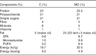 To ensure homogeneity of mothers studied in the different experimental groups, female albino Wistar rats were obtained exclusively from Instituto Nacional de Ciencias Médicas y Nutrición Salvador Zubirán (INCMNSZ), Mexico. All procedures were approved by INCMNSZ Animal Experimentation Ethics Committee. Animals were held in American Association for Accreditation of Laboratory Animal Care. We studied female rats F0 fed control (C, control n 5) (laboratory chow Zeigler Rodent RQ22–5) or obesogenic diet (MO, n 5) (Table 1) during growth (21–120 d of life) and pregnancy and lactation, as previously described in detail( Reference Rodriguez, Rodriguez-Gonzalez and Reyes-Castro 22 ). Female rats were mated at 120 d of age. Mothers delivering litters over fourteen or under ten were excluded from the experiment. To ensure F1 offspring homogeneity, on postnatal day (PND) 2, all F1 litters studied were adjusted to ten pups with equal numbers of male and female pups whenever possible. A fixed amount of fresh food was provided daily. During lactation, the food remaining after 24 h was weighed daily( Reference Rodriguez, Rodriguez-Gonzalez and Reyes-Castro 22 ). Offspring were weaned at PND 21, housed five per cage and fed the control diet.