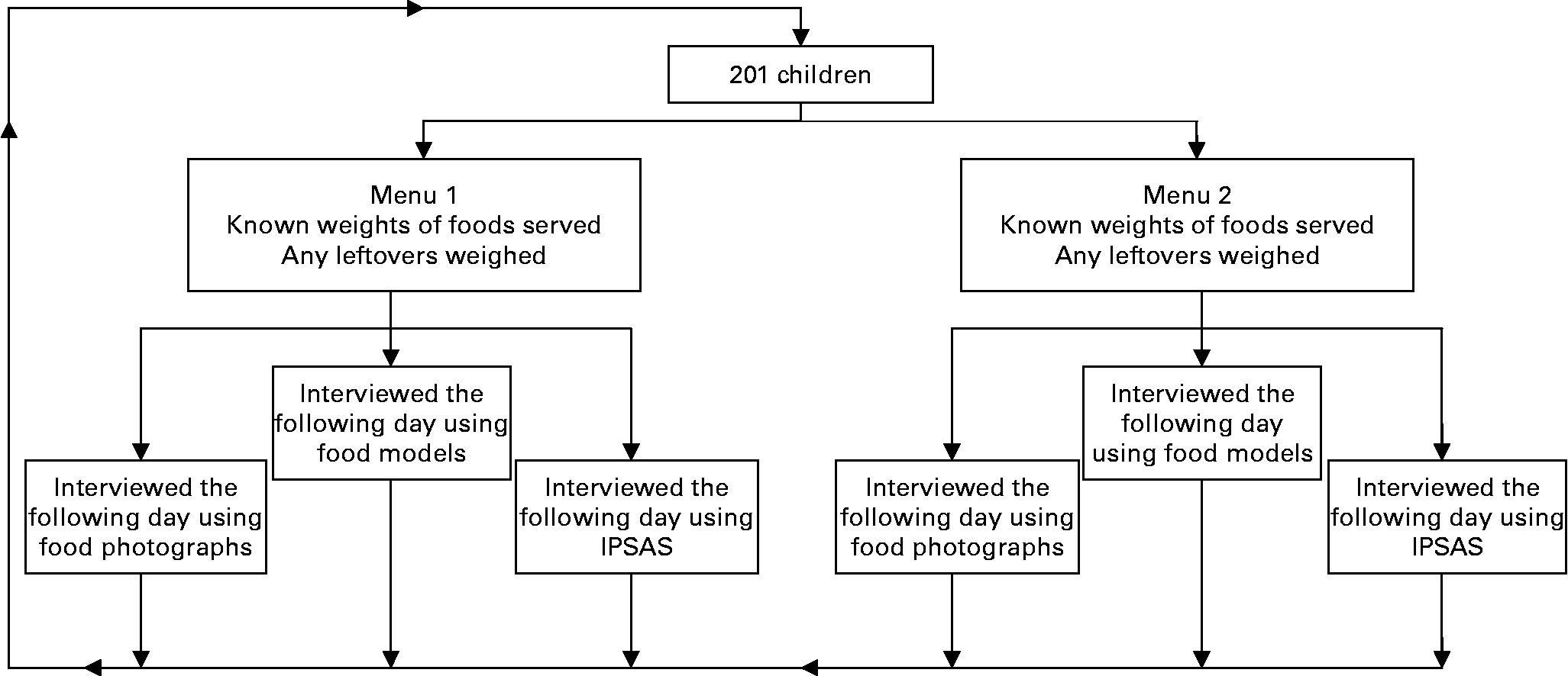 The design of the study was to provide children with foods to eat of known weights and to assess the accuracy with which the children estimated the portion sizes of those foods using each portion size assessment tool in a 24 h recall interview. Using the tools, children were asked to estimate the amount of food that they were served and the amount of food they left over. The foods were served as two menus. Estimates for each menu using each tool were made on separate occasions. The order of administration of the interviews was randomised to minimise the impact of any potential learning effect. A summary of the study design is given in Fig. 1.