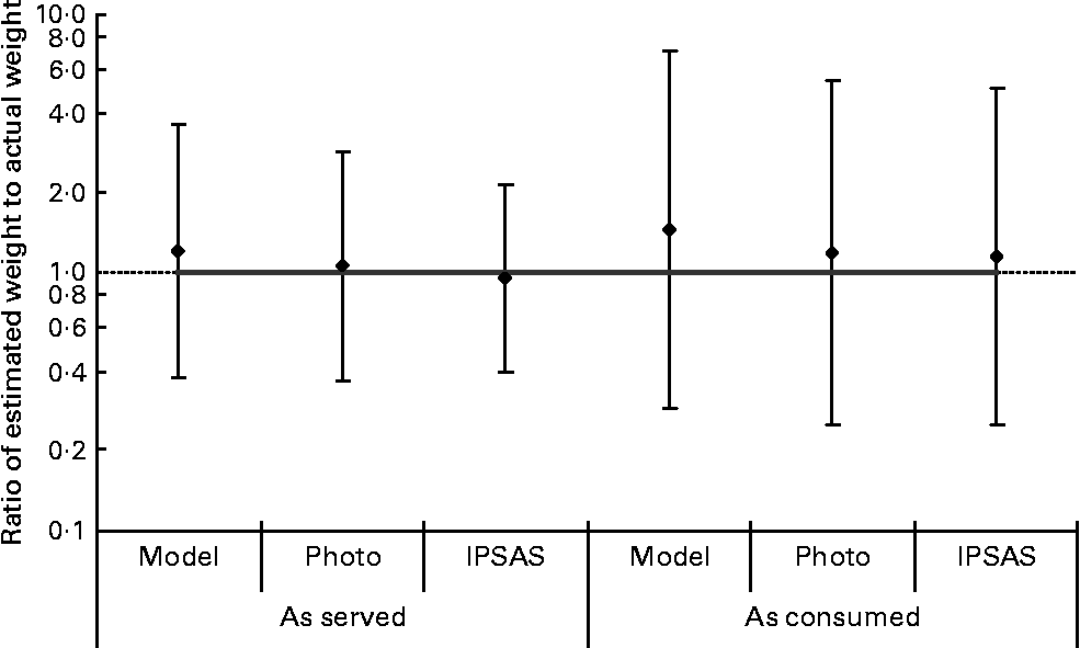 Fig. 5 Accuracy of children's estimates of food portion size using each portion size assessment tool – all foods combined (as served and as consumed). The line at 1·0 indicates where all the points would lie if estimates of portion size were completely accurate; ratios less than 1 indicate underestimation and those more than 1 indicate overestimation. Values are geometric means, with vertical bars representing ± 2 standard deviations. Model, food models; Photo, food photographs; IPSAS, interactive portion size assessment system.