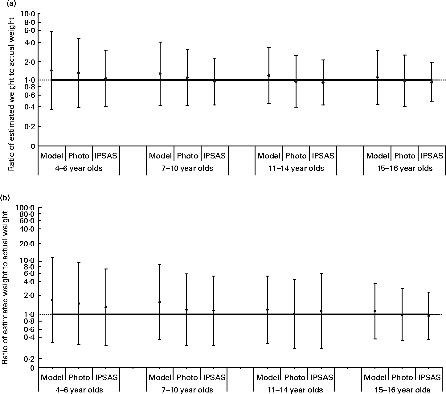Fig. 6 Accuracy of children's estimates of food portion size (a) as served and (b) as consumed using each portion size assessment tool. All foods have been combined and are presented by age group. The line at 1·0 indicates where all the points would lie if estimates of portion size were completely accurate; ratios less than 1 indicate underestimation and those more than 1 indicate overestimation. Values are geometric means, with vertical bars representing ± 2 standard deviations. Model, food models; Photo, food photographs; IPSAS, interactive portion size assessment system.