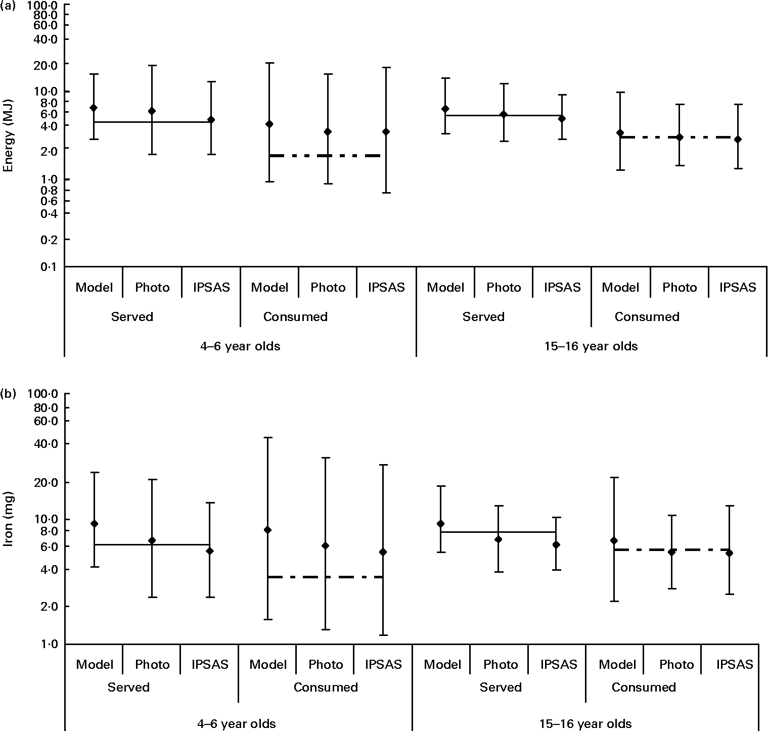 Fig. 7 Impact of errors in portion size assessment on the estimated energy content (a) and estimated Fe content (b) of menu 1 foods for 4–6 and 15–16-year-old children. Values are geometric means, with vertical bars representing ± 2 standard deviations. Model, food models; Photo, food photographs; IPSAS, interactive portion size assessment system; (–), actual served; (