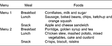 The foods selected for inclusion in the study were foods commonly consumed by children in each age group. The principal data source was the NDNS of young people aged 4–18 yearsReference Gregory and Lowe5. The foods were selected to include a variety of appearances, consistencies and textures. Both single foods and foods served as part of a meal were included. Combinations of these foods were used to create two menus each of breakfast, lunch and a snack. Details of the foods served to the children are given in Table 1.