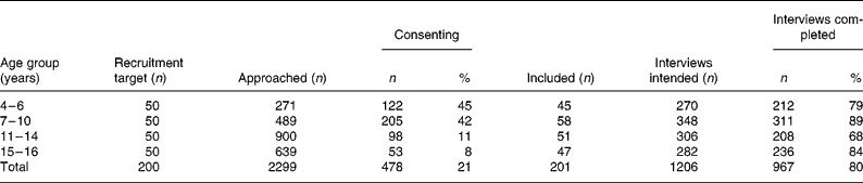 The target was to include 200 children in the study. A total of 201 children between the ages of 4 and 16 years participated in the study, 21 % of those approached. Interview completion rates were high for all age groups, with 80 % of all intended interviews completed (Table 2).