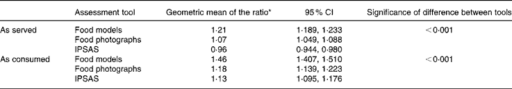 To investigate the relative performance of the portion size assessment tools a univariate ANOVA with child identification and tool as fixed factors was performed. This allowed us to predict the significance of the difference in the ratio of the child's estimate of the amount of food served (or consumed) to the actual weight of the food served (or consumed) between the different tools.