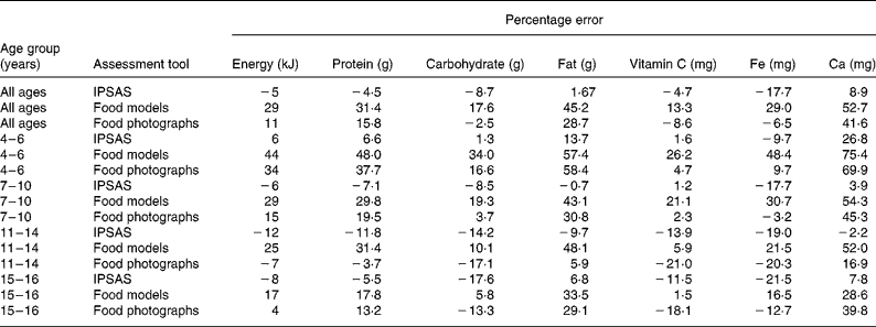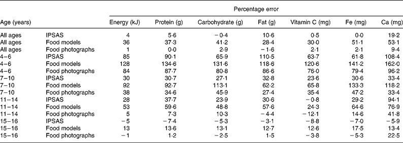 The fact that the errors in portion size estimation differed with type of food would be expected to result in the balance of nutrients being different rather than all nutrients being under- or overestimated to the same extent. Using estimates of amounts of food served, the percentage error in nutrient content was low using the IPSAS for even the 4–6-year-old age group. The accuracy of estimates of foods served made by the 4–6 year olds using the IPSAS compare favourably with the accuracy of estimates made by adults using food photographsReference Nelson, Atkinson and Darbyshire13. Mean percentage errors were 6 and 7 % for energy, 13·7 and 25 % for fat, 1·6 and 21 % for vitamin C, − 9·7 and 0·3 % for Fe and 26·8 and 7·7 % for Ca for 4–6 year olds and adults respectively.