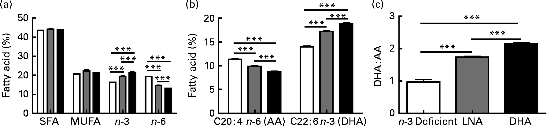 ) and DHA (■) consumption on the relative percentage of fatty acid in frontal cortex. (a) Dietary DHA increased the amount of total n-3 PUFA and decreased total n-6 PUFA compared to n-3 PUFA-deficient diet (□). The LNA-enriched diet produced an intermediate effect on n-3 PUFA and n-6 PUFA levels. SFA and MUFA levels were not modified by diets. (b) Chronic DHA intake increased the proportion of DHA and reduced the proportion of arachidonic acid (AA) in the frontal cortex, compared to n-3 PUFA-deficient diet. Again, the LNA diet produced an intermediate effect. (c) Consumption of both LNA or DHA increased the DHA:AA ratio, compared to n-3 PUFA-deficient diet, but the effect of DHA was significantly more pronounced. Values are means, with their standard errors represented by vertical bars, n 9 for the n-3 PUFA-deficient group and n 13 for LNA and DHA groups. Statistical comparisons were performed using a one-way ANOVA followed by a Tukey–Kramer post hoc test. *** Mean values were significantly different (P < 0·001).