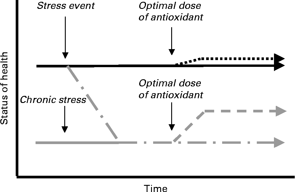 , the improvement in health status when an optimal dose of an antioxidant is given whilst in a state of stress.
