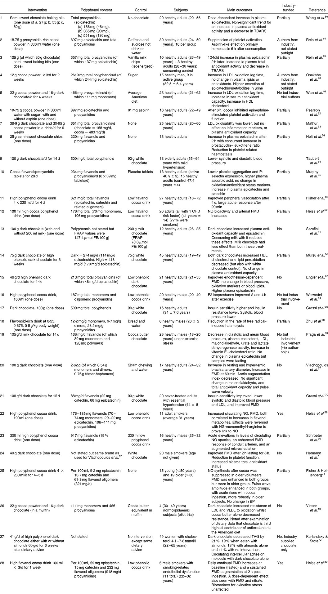 Table 1 shows human trials with interventions using cocoa in different forms from 2000 to 2007. For each study, the intervention and its polyphenol content (if available), the controls, subject type and the main outcomes are described. Each of these trials investigated at least one health-related end-point. The end-points selected at the beginning of this period were suppression of platelet activationReference Rein, Paglieroni, Wun, Pearson, Schmitz, Gosselin and Keen14 and improvement of plasma antioxidant activity and lipid oxidationReference Rein, Lotito, Holt, Keen, Schmitz and Fraga15. These end-points were logical as they had been shown previously to be affected positively by other sources of polyphenols such as red wineReference Kondo, Matsumoto, Kurata, Tanahashi, Koda, Amachi and Itakura16–Reference Rein, Paglieroni, Pearson, Wun, Schmitz, Gosselin and Keen20. The rate of publication has generally been increasing since 2000. There were two human trials published in 2001, three in 2002, five in 2003, three in 2004, six in 2005 and five in 2006 (one so far in 2007). More often than not, the studies yield at least one positive and significant result although, as more than one end-point is measured in most of the trials, secondary outcomes are often unchanged. These trials do not include those investigating the metabolism and pharmacokinetics of chocolate components. End-points included blood pressure, insulin sensitivity and resistance, endothelial function and flow-mediated dilation (FMD), platelet function, plasma antioxidant status and oxidative stress, plasma lipids (levels and oxidation), nitric oxide (NO) and haemolysis. There is one epidemiological study that correlates long-term cocoa intake with lower overall and cardiovascular mortality in elderly menReference Buijsse, Feskens, Kok and Kromhout21 and a prospective study in post-menopausal women which found a borderline inverse association of chocolate intake and CVD mortalityReference Mink, Scrafford, Barraj, Harnack, Hong, Nettleton and Jacobs22. The research is predominantly focused on effects on the vascular system, however, there are other areas of research on man in vivo which are not so extensively investigated, such as those concerned with cognitionReference Francis, Head, Morris and Macdonald23, cancerReference Ramljak, Romanczyk, Metheny-Barlow, Thompson, Knezevic, Galperin, Ramesh and Dickson24 and diabetesReference Grassi, Lippi, Necozione, Desideri and Ferri25.