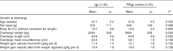 At discharge, rates of weight gain achieved by each group were significantly slower than the fetal rate (birth to discharge: Igp: P<0·001; RPgp: P<0·001; and after recovery of birth weight to discharge: Igp: P<0·001; RPgp P=0·051).