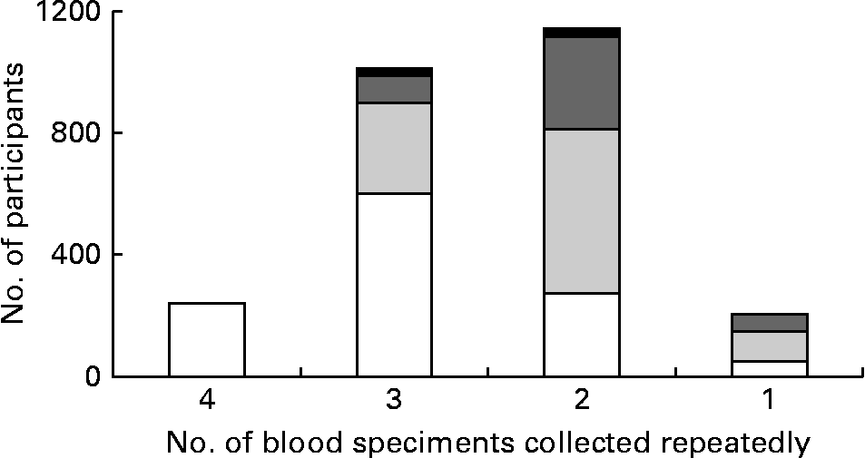 Fig. 1 The number of serum specimens collected repeatedly in four age groups (6–17 years (□), 18–44 years (