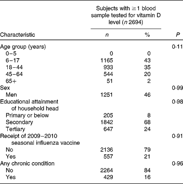 Participants included in this study of vitamin D were part of a household-based prospective study of influenza, as describe elsewhere( Reference Cowling, Ng and Ma 15 ). In 2009–2010, we recruited all members of 796 households, and each household included a child 6–17 years of age who was randomly allocated to receive either a single dose of seasonal trivalent inactivated influenza vaccine or placebo in a double-blind manner. Enrollment, collection of serum specimens and vaccinations were performed by trained research staff at a study clinic. Serum specimens were collected at baseline (September 2009 through February 2010) and after 12 months at the end of the follow-up period (‘post-study’, October through December 2010). Serum specimens were also collected 1 month after vaccination from the children who received vaccine or placebo (‘post-vaccination’, October 2009 through February 2010). A subset of participants also provided blood samples half-way through the study (‘mid-study’, April and May 2010).