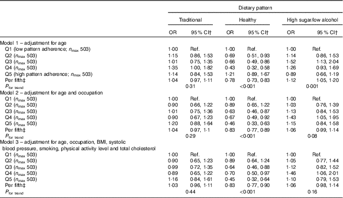 Three DP were determined by PCA using the FFQ data – traditional, healthy, high sugar/low alcohol. Together, these three DP explained 23·4 % of the total variance. The traditional pattern had high factor loading scores for the following foods: red meat, vegetables, processed meat, whitefish/shellfish, eggs, organ meat, poultry, lard, butter, potato, cheese, milk, oily fish, grains, fried potato, beer, sugar, tap water, soft drinks, tea and confectionery. The healthy pattern was characterised by high positive loadings for cereals, fruit, high-fibre bread, confectionery, vegetables, natural juices, margarine, milk and cream and negative loadings for beer, lard and butter. The high-sugar/low-alcohol pattern had high factor loading scores for tea, sugar, milk, white bread, confectionery, fried potato and negative loadings for wine, other alcoholic drinks, coffee, natural juices, high-fibre bread and beer (online Supplementary Table S2).