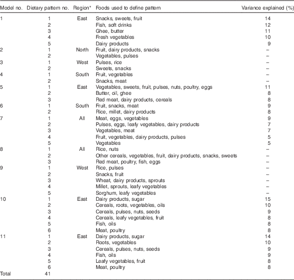 We separated the models by region, year, age and sex in order to determine whether they showed a relationship with the distinguishing food groups found in Indian dietary patterns. The consumption of many food groups was variable across the studies from different regions. Sweets and snacks were more likely to characterise diets in the East and South, whereas fruit, vegetables, rice and pulses were more likely to characterise diets in the North and West. Dietary patterns from the East and South were also more likely to be defined by meat or fish consumption than those from the North and West.