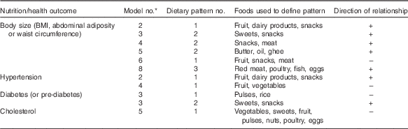 Six models reported associations between dietary patterns and nutrition/health outcomes (models 2–6 and 8; Table 3). The most common outcome studied (n 6) was body size (BMI, abdominal adiposity or waist circumference), and other studies reported associations with hypertension (n 2), diabetes (n 2) and cholesterol (n 1).