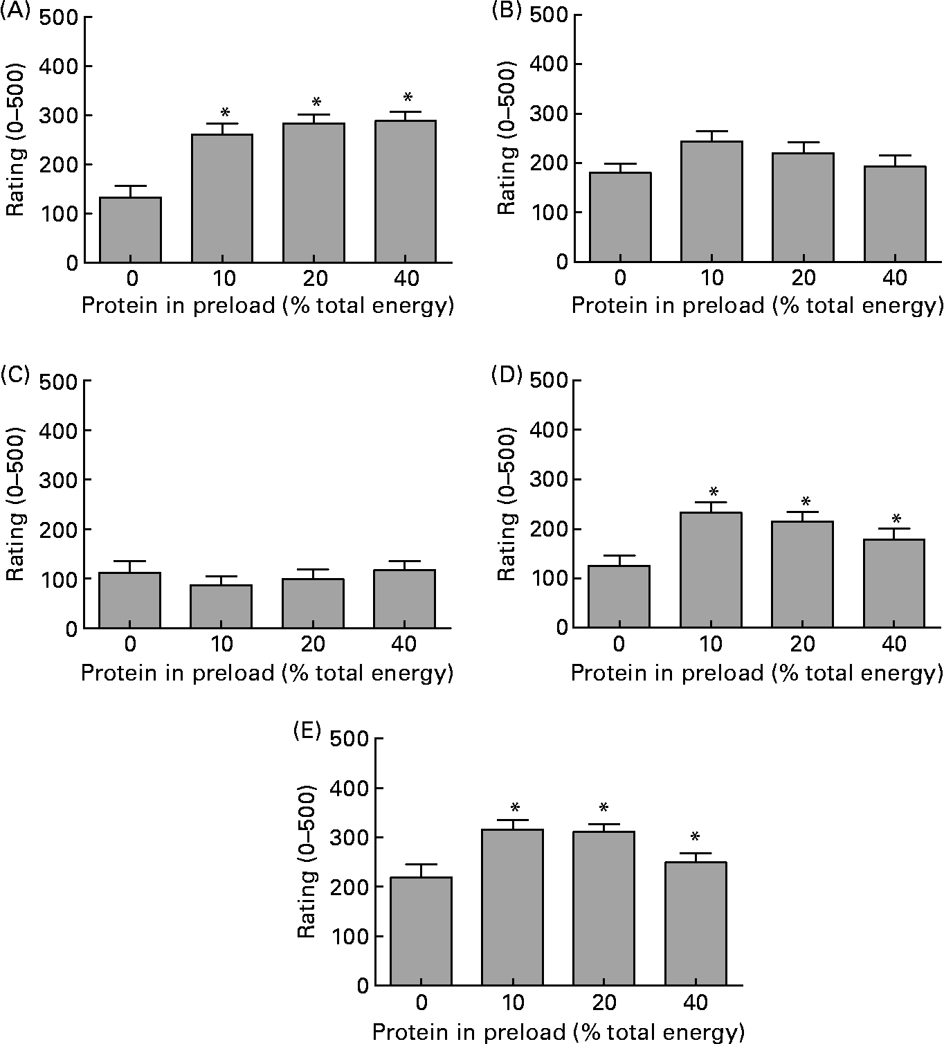 Assessing the independent effects of macronutrient manipulations is difficult while attempting to control all factors that have been reported to affect satiety, such as the energy content, weight, volume, energy density and sensory and hedonic properties of a food or drink(Reference Stubbs, Ferres and Horgan22–Reference Rolls, Rowe and Rolls25). This protocol was designed to minimise the effects of energy, volume and energy density of the protein-containing preloads, by matching preloads for energy and volume. Furthermore, replacing the protein energy with carbohydrate ensured all energy-containing preloads had similar energy densities. However, exchanging protein for carbohydrate meant that an increase in the amount of protein in the preload was accompanied by a reduction in carbohydrate. We cannot rule out that this difference in the carbohydrate content of the preloads may have contributed to the observed findings without purposefully manipulating the carbohydrate content of the preloads for comparison.