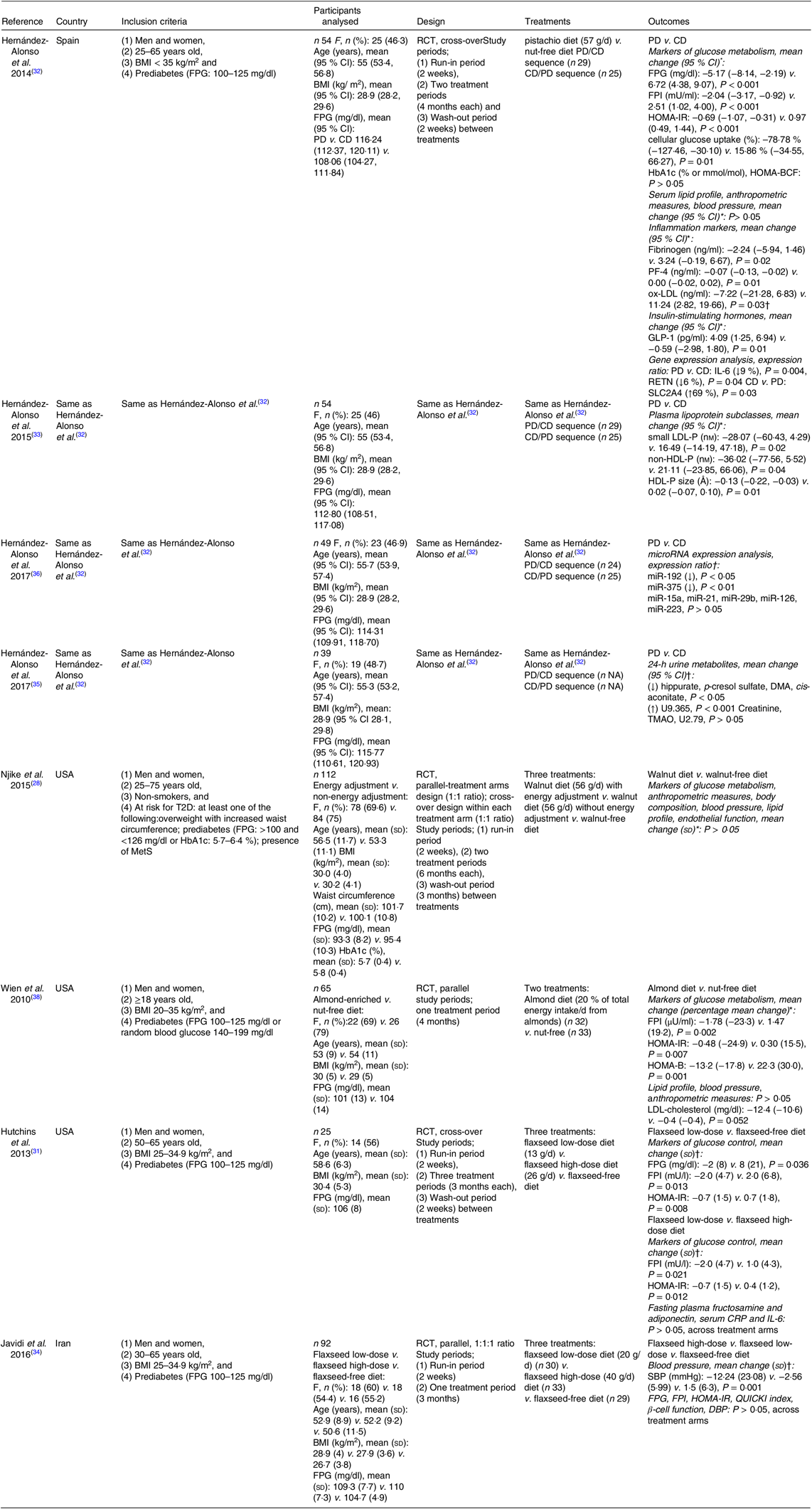 RCT, randomised controlled trial; PD, pistachio diet; CD, control diet; FPG, fasting plasma glucose; FPI, fasting plasma insulin; HOMA-IR, homeostasis model assessment of insulin resistance index; HbA1c, glycated Hb; HOMA-BCF, HOMA of β-cell function; PF-4, platelet factor 4; ox-LDL, oxidised-LDL; GLP-1, glucagon-like peptide-1; RETN, resistin; SLC2A4, solute carrier family 2, facilitated glucose transporter member 4; F, female; small LDL-P, small LDL-particle; non-HDL-P; non-HDL-particle; DMA, dimethylamine; TMAO, trimethylamine N-oxide; T2D, type 2 diabetes mellitus; MetS, metabolic syndrome; HOMA-B, HOMA of β-cell function; CRP, C-reactive protein; SBP, systolic blood pressure; QUICKI index, quantitative insulin sensitivity check index; DBP, diastolic blood pressure.