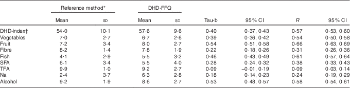 Mean and standard deviation scores of the DHD-index and its components calculated from the DHD-FFQ and the reference method are presented. Kendall’s tau-b coefficients were calculated between scores derived from the reference method and from the DHD-FFQ to examine ranking of participants. Spearman’s correlations are shown to allow comparison with previous studies. CI for these correlations were obtained using Fisher’s Z -transformation. Agreement of the DHD-index score between the two methods was examined using a Bland–Altman plot( Reference Bland and Altman 32 ).