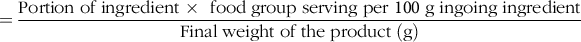 $ \displaystyle= {{{\rm{Portion}}\;{\rm{of}}\;{\rm{ingredient}}{\kern 1pt} \times {\kern 1pt} \;{\rm{food}}\;{\rm{group}}\;{\rm{serving}}\;{\rm{per}}\;100\;{\rm{g}}\;{\rm{ingoing}}\;{\rm{ingredient}}} \over {{\rm{Final}}\;{\rm{weight}}\;{\rm{of}}\;{\rm{the}}\;{\rm{product}}\;\left( {\rm{g}} \right)}}$