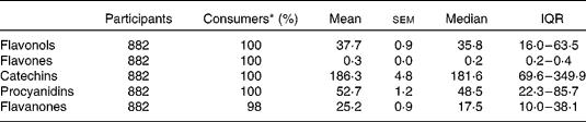 Table 3 Dietary flavonoid intake (mg/d) in the Lothian Birth Cohort 1936 study(Mean values with their standard errors, medians and interquartile ranges (IQR))