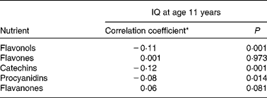 Table 5 Association between flavonoid intake and intelligence quotient (IQ) at age 11 years in the Lothian Birth Cohort 1936 study(Correlation coefficient values and P values)