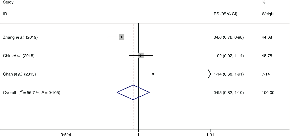 Fig. 8. Random effects meta-analysis of cross-sectional studies that examined fruit consumption and non-alcoholic fatty liver disease (NAFLD) risk. Weights are from random effects analysis. ES, effect size.