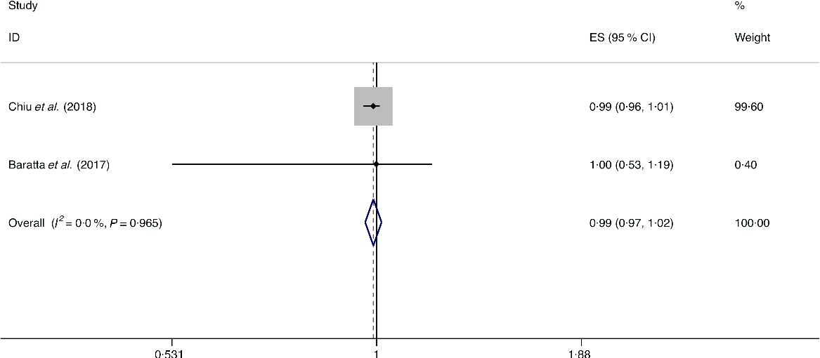 Fig. 9. Fixed effects meta-analysis of case–control studies that examined fruit consumption and non-alcoholic fatty liver disease (NAFLD) risk. Weights are from fixed effects analysis. ES, effect size.