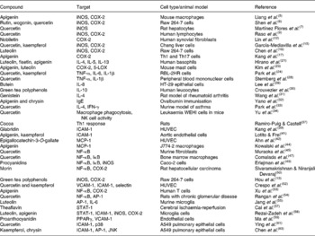 Flavonoids have been reported to possess a wide range of activities in the prevention of common diseases, including CHD, cancer, neurodegenerative diseases, gastrointestinal disorders and others(Reference González-Gallego, Sánchez-Campos and Tuñón3). These effects appear to be related to the various biological/pharmacological activities of flavonoids. A large number of publications suggest immunomodulatory and anti-inflammatory properties of these compounds. However, almost all studies are in vitro studies with limited research on animal models and scarce data from human studies. The majority of in vitro studies have been carried out with single flavonoids (generally aglycones) at rather supraphysiological concentrations, and few studies have investigated the anti-inflammatory effects of physiologically attainable flavonoid concentrations in healthy subjects(Reference Tuñón, García-Mediavilla and Sánchez-Campos4).