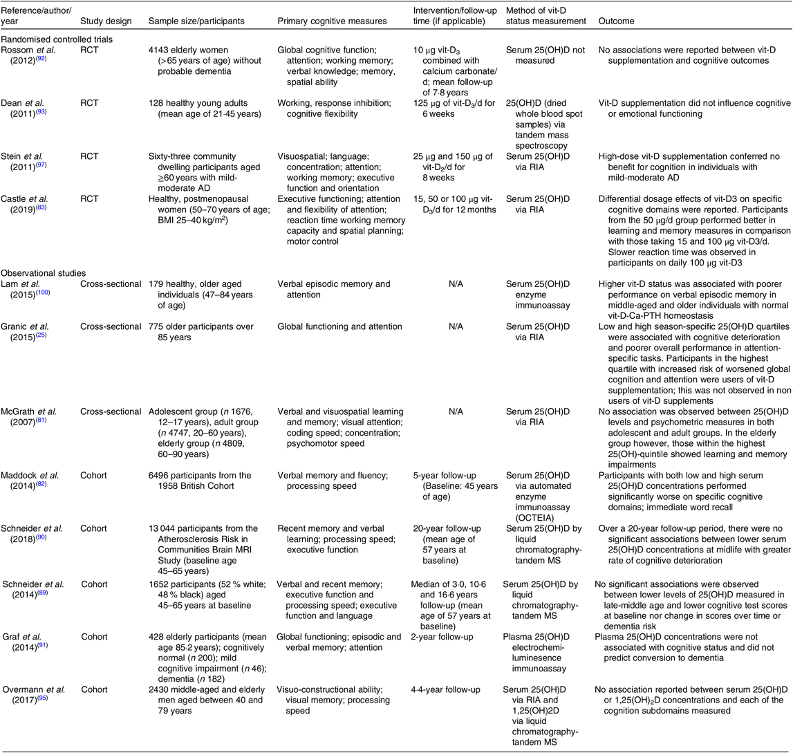 Table 1. Summary of randomised controlled trials and observational studies exploring vitamin D (vit-D) and cognitive outcomes