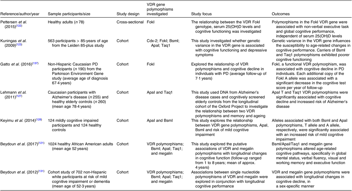 Genetic variability for vit-D metabolism may be associated for an individual’s susceptibility to cognitive decline. Polymorphisms of the VDR gene have been shown to influence the susceptibility to age-related changes in cognitive functioning and progression of neurodegenerative diseases such as Alzheimer’s disease, mild cognitive impairment, Parkinson’s disease and implicated with cognitive function(Reference Pettersen, Fok and Robin Hsiung122,Reference Kuningas, Mooijaart and Jolles123) . However, literature contributing to the delineation of the putative metabolic pathways that result in cognitive dysfunction is varied and inconclusive.