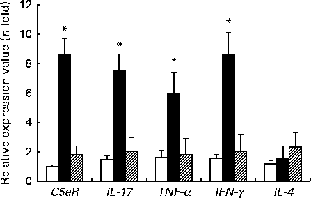 Fig. 2 Expressions of C5a receptor (C5aR), IL-17, TNF-α, interferon-γ (IFNγ) and IL-4 mRNA in small-intestinal intraepithelial lymphocyte γδ-T cells. All the data are representative of duplicate measurements (n 6). Values are means, with standard deviations represented by vertical bars. Differences among the groups were analysed by a one-way ANOVA with Tukey's multiple-comparison test. □, Normal control group; ■, dextran sulphate sodium (DSS)-treated group fed the control diet;