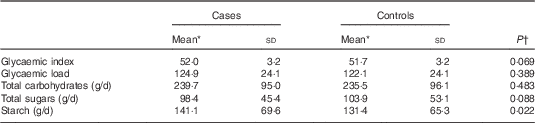 A total of 380 cases (175 men and 205 women, aged 58±16 and 53±15 years, respectively) and 719 age-, sex- and province of residence-matched controls were included in the analysis. Demographic and clinical characteristics of cases and controls are reported in Table 1. Educational attainment and marital status were similar in cases and controls, whereas cases tended to have more fair skin types, high tendency to burn and were more likely to report a history of sunburns, ever and particularly after 18 years. Dietary characteristics related to the amount of carbohydrates, summarised in Table 2, showed that cases tended to have slightly higher GI and slightly lower total sugar intakes compared with controls and a higher intakes of starch. GI and GL were positively correlated (r 0·44; 95 % CI 0·39, 0·48).