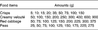 Commonly consumed amorphous-shaped foods with different physical characteristics (breakfast cereals, apple sauce, carrots and peas, spaghetti, rice and French fries, crisps, peas, red cabbage, and velouté of chicken (a creamy sauce with pieces of chicken, meatballs and mushrooms)) were selected for the study. Amorphous foods do not have a specified shape; rather they are mounded or assume the shape of the container in which they are served(Reference Chambers, Godwin and Vecchio20).