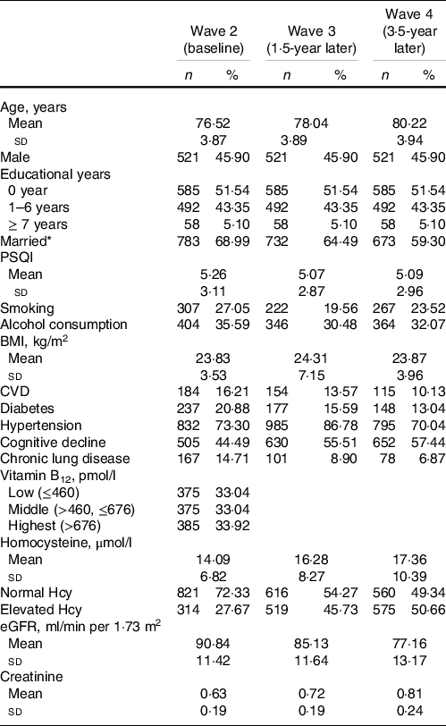 The included sample characteristics across the three waves are presented in Table 1. In this study, a total of 1135 subjects were included. The mean age was 76·52 (sd 3·87) years. The mean plasma Hcy level was 14·09 (sd 6·82) μmol/l at baseline and then increased to 16·28 (sd 8·27) and 17·36 (sd 10·39) μmol/l at the 1·5- and 3·5-year follow-ups, respectively (P < 0·001). The number of subjects with elevated plasma Hcy levels was 314 (sd 27·67 %) at baseline and then increased to 519 (sd 45·73 %) and 575 (sd 50·66 %) at the 1·5- and 3·5-year follow-ups, respectively. The mean eGFR was 90·84 (sd 11·42) ml/min per 1·73 m2 at wave 2 and then increased to 85·13 (sd 11·64) and 77·16 (sd 13·17) ml/min per 1·73 m2 at subsequent follow-ups (P < 0·001). The detailed characteristics of the study population stratified by eGFR at baseline are presented in Table 2.