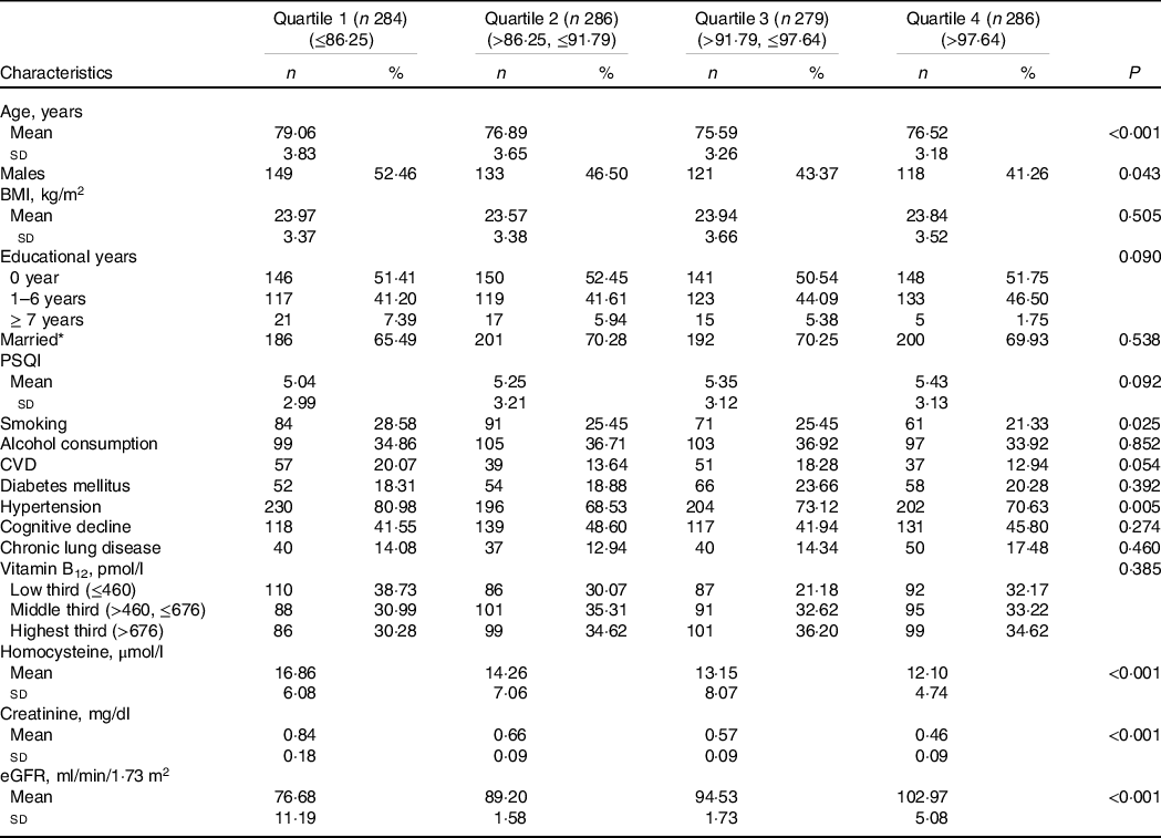 Demographic, clinical characteristics and lifestyles were collected from the Rugao Longevity and Ageing Study. Demographic data included age, sex, marital status and educational years. Clinical characteristics included CVD, diabetes mellitus, hypertension, chronic lung disease, cognitive function decline (assessed by the revised Hasegawa’s dementia scale and subjects with cognitive scores less than 21·5 were defined as cognitive decline(Reference Imai30)), antihypertension drugs, antidiabetic drugs and vitamin B12 concentration (in wave 2). CVD included cerebral infarction, stroke, cerebral haemorrhage, CHD, myocardial infarction and heart failure. Chronic lung disease included pulmonary tuberculosis, chronic bronchitis, asthma or chronic obstructive pulmonary disease. Participants who self-reported a diagnosis of diabetes mellitus, used medication for diabetes mellitus or had a fasting glucose greater than 125 mg/dl were coded as having diabetes mellitus. Lifestyles included smoking, alcohol consumption, sleep quality (assessed by the Pittsburgh Sleep Quality Index(Reference Buysse, Reynolds and Monk31)) and BMI. Vitamin B12 was categorised into three groups according to tertiles (lowest third: ≤460 pmol/l; middle third: >460, ≤676 pmol/l; and highest third: > 676 pmol/l).