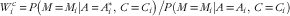 $$W_{i}^{c} \, {\equals}\, {{P\left( {M{\rm \, {\equals}\, }\left. {M_{i} } \right|A\, {\equals}\, A_{i}^{{\rm {\asterisk}}} ,\,C{\rm \, {\equals}\, }C_{i} } \right)} \mathord{\left/ {\vphantom {{P\left( {M{\rm \, {\equals}\, }\left. {M_{i} } \right|A\, {\equals}\, A_{i}^{{\rm {\asterisk}}} ,\,C{\rm \, {\equals}\, }C_{i} } \right)} {P\left( {M{\rm \, {\equals}\, }\left. {M_{i} } \right|A{\rm \, {\equals}\, }A_{i} ,\,C{\rm \, {\equals}\, }C_{i} } \right)}}} \right. \kern-\nulldelimiterspace} {P\left( {M{\rm \, {\equals}\, }\left. {M_{i} } \right|A{\rm \, {\equals}\, }A_{i} ,\,C{\rm \, {\equals}\, }C_{i} } \right)}}$$
