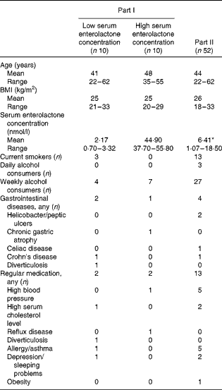 Table 1 Characteristics of the study participants at recruitment in part I, ‘Cross-sectional comparison of faecal microbiota in groups with high and low enterolactone concentrations’ and in part II, ‘Cross-over intervention study’ (Mean values and ranges)