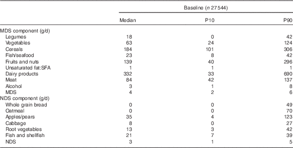 Table 1 Intake of food groups in the Mediterranean diet score (MDS) and the Nordic diet score (NDS) at baseline (Medians and 10th and 90th percentiles (P))