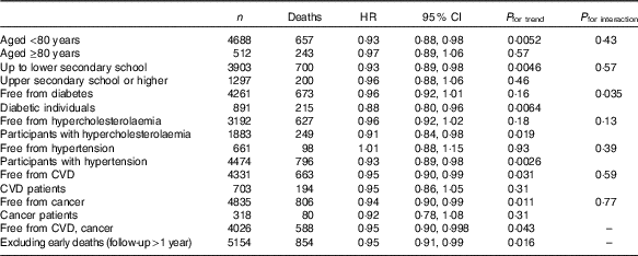 Sensitivity analyses for the association of 1-point increment in the MDS and all-cause mortality are reported in Table 4. An inverse association was confirmed in all sub-groups except within CVD or cancer patients, individuals aged ≥80 years or without prevalent diabetes or hypercholesterolaemia.