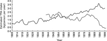 Analogous methods were used to calculate intakes of LA, ALA, EPA+DHA and TFA by experimental and control dieters in other RCT as shown in Tables 3, 7 and 9 and their legends. For the two US studies, the LA Veterans Study and the Minnesota Coronary Study, the consumption of TFA from margarines and shortenings as food was estimated as using economic disappearance data for the years 1959–68 and 1967–73, respectively (Fig. 6) (42), and dividing by energy intake to determine en %. Compared to published literature on US TFA intake, these values are conservative estimates(Reference Enig, Atal and Keeney94). For the three UK studies, the RCOT(Reference Rose, Thomson and Williams37), MRC Soy(35) and DART(Reference Burr, Fehily and Gilbert18) TFA were estimated from UK National Food Survey data for per capita household margarine use for the years 1960–4, 1960–7 and 1983–5, respectively(89)(Fig. 6). These figures are comparable to other published literature on UK margarine intake(Reference Greaves and Hollingsworth91) and are likely to underestimate total TFA intake as they do not include TFA from shortenings, baked goods or fried foods. For the Sydney Diet-Heart Study(Reference Woodhill, Palmer and Leelarthaepin38), TFA were estimated from the Office of Economic and Community Development Food Consumption Statistics for per capita apparent consumption of margarine in Australia in 1966–73(Reference Roberts95, 96). This estimate is likely to underestimate total TFA intake as it does not include TFA from shortenings, baked goods or fried foods.