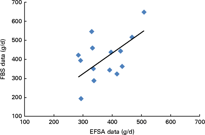Fig. 6 Correlation between European fruit and vegetable consumption assessed using the European Food Safety Authority (EFSA) Comprehensive Database and the WHO's food balance sheets (FBS = EFSA × 1·08, R 2 0·234, y= 1·0809x). A colour version of this figure can be found online at http://www.journals.cambridge.org/bjn