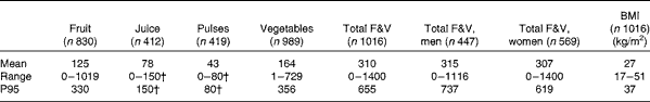 Table 1 Consumption of fruit and vegetables (F&V) by UK adults (g/d)* (Means, ranges and 95th percentiles (P95))