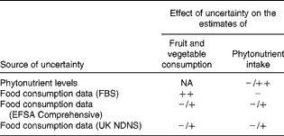 The overall effect of uncertainties in the assessments affects different methods in the tiered approach differently. More aggregated FBS data make it more likely that total fruit and vegetable consumption will have been overestimated because it is not possible to identify all varieties and form separately. Vegetables that would not normally be included in the WHO targets cannot be easily excluded and wastage due to preparation techniques may not be taken into account. The FBS data also cover entire populations so that it is not possible to consider adults separately resulting in a small underestimation. Estimates of phytonutrient intake are also probably reduced because particular fruit and vegetable varieties high in phytonutrients cannot be identified. The EFSA Comprehensive Database provides more information about foods ‘as eaten’ and so is likely to give a better estimate of both fruit and vegetable consumption and phytonutrient intakes. However, because the database contains data from national surveys that did not use the same survey methodologies, direct comparisons are less reliable. The UK NDNS data probably provide the most sound basis for assessment. However, the relatively short survey period and the potential omission of phytonutrients incorporated into composite foods may introduce uncertainties. The main sources of uncertainty can be summarised using the semi-quantitative method recommended by the EFSA Scientific Committee( 24 ) (Table 3).